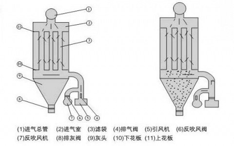(2) 清灰及自動控制: 除塵器進行一段時間后,濾袋內(nèi)表面捕集的粉塵增厚,除塵器的運行阻力上升,當增加一定值后,這就需要對除塵布袋進行清灰,即通過外力將濾袋內(nèi)表面上附著的粉塵清除掉,使除塵器的運行陰力下降,陰力下降下一定值后,該室濾袋又投入正常運行。