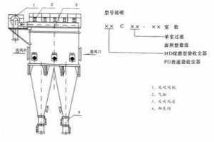 除塵器由1—含塵氣體入口,2—過濾室,3—凈氣出口,4—反吹清灰裝置,5—防爆閥,6—灰斗,7—卸灰閥等主要部件組成。