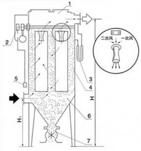 含塵氣體由除塵器進風口進入中,下箱體,通過濾袋進入上箱體的過程中由于濾袋的各種效應作用。將粉塵氣體分離開,粉塵被吸咐在濾袋上,而氣體穿過濾袋由文氏管進入上箱體,從出風口排出。含塵氣體通過濾袋凈化的過程中,隨著時間增加,而積在濾袋上的粉塵越來越多,因而使濾袋的阻力逐漸增加,通過濾袋子的氣體量逐漸減少,為了使除塵器能正常工作所以要把阻力控制在限定范圍內(一般為120-150毫米水柱)。這樣當阻力升到限定范圍的時候,由控制儀就要發(fā)出指令按順序觸發(fā)各控制閥,開啟脈沖閥。氣包內的壓縮空氣由噴吹管各孔經文氏管噴射到各對應的濾袋內,濾袋在氣流瞬間反向作用下急劇膨脹,使積在濾袋表面的粉塵脫落,濾袋得再生。被清掉的粉塵落入灰斗經排灰系統排出機體,由于積在濾袋上的粉塵定期清除,被凈化的氣體正常通過,保證除塵器正常工作。