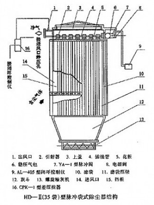 HD型環(huán)隙噴吹脈沖布袋除塵器是在脈沖布袋除塵器基礎上進行改進的一種先進除塵裝置。其結構特點是具有環(huán)隙引射器、雙膜片脈沖閥及快速拆卸的焊接管組成的噴吹裝置,靠自重及箱體負壓保持密封的上揭蓋,采用高抗干擾的HTL集成電路和可控硅無觸點開關的AL—1型、AL—2型電控儀。